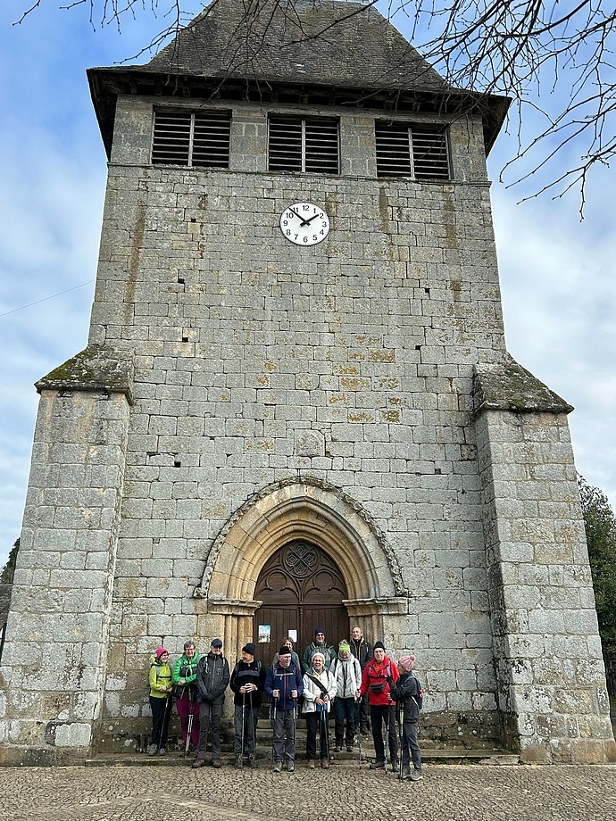 Notre président “empêché” est présent sur le départ et nous confie à notre guide du jour Jean-Claude P. Arrivés à St Salvadour, après une brève visite au musée Paucard, nous prenons la pause devant l’église.